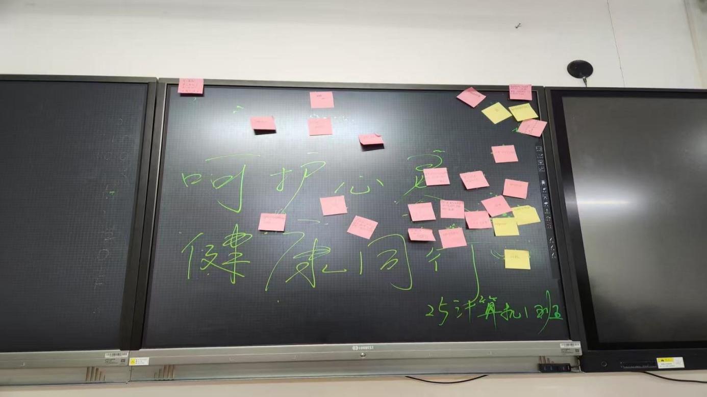 以笔寄情,留存心声。活动前筹备色彩温润的便签纸,组织每位同学书写对同窗的真挚期许与美好祝福,字里行间传递出真诚的情感。书写完成后,同学们自主将承载心意的便签张贴于专属祝福墙,便签错落排列,形成充满温情与善意的互动空间。过程中,轻缓悠扬的乐声持续播放,每一次摘取便签的动作均具有仪式感,所获不仅是一张便签,更是一份意外的温暖回馈。在期待与未知中,同学们通过阅读便签内容感受彼此的真诚善意,实现情感的传递与共鸣。